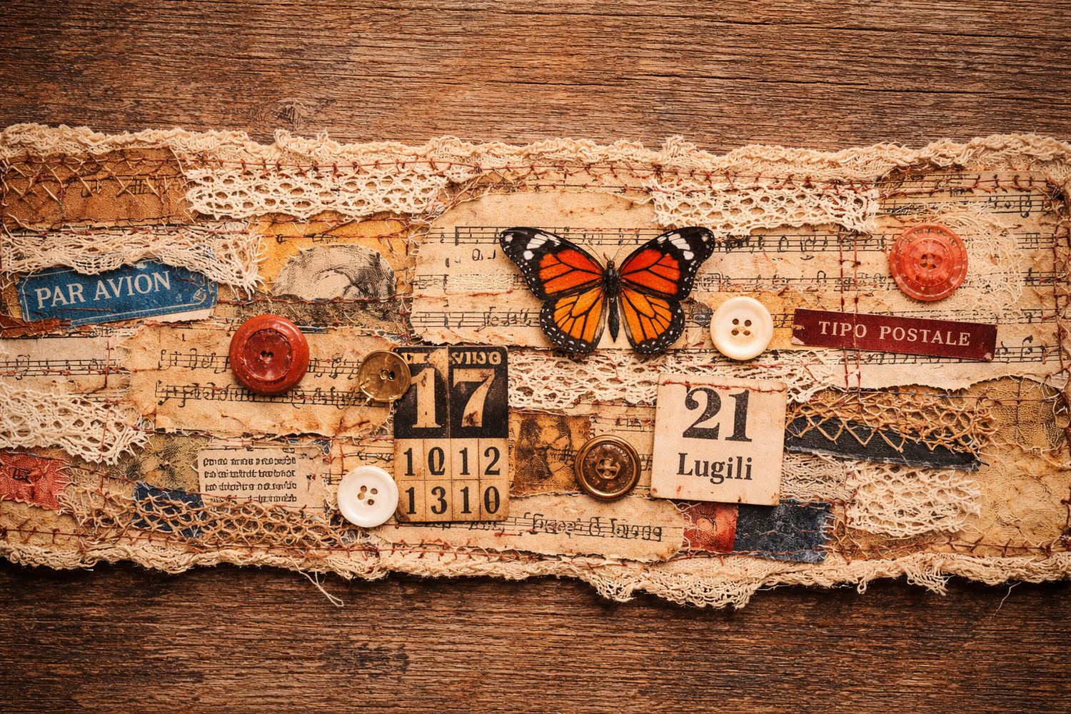 vecchie carte, ritagli di stoffa, nastri avanzati, bottoni dimenticati in un cassetto.
