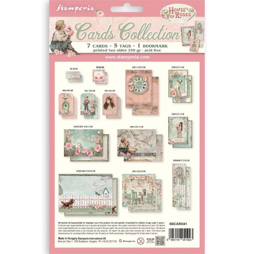7 card - 5 tag - 1 segnalibro stampato fronte/retro su carta da 250 gr - acid free. Ogni confezione contiene card e tag stampati doppi, coordinati con la collezione House of Roses.