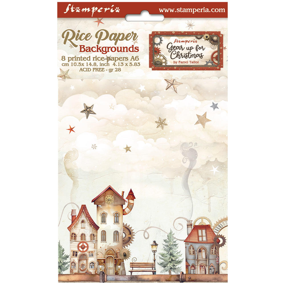 Selezione di 8 carte di riso in formato A6 a tema Gear up for Christmas by Stamperia.