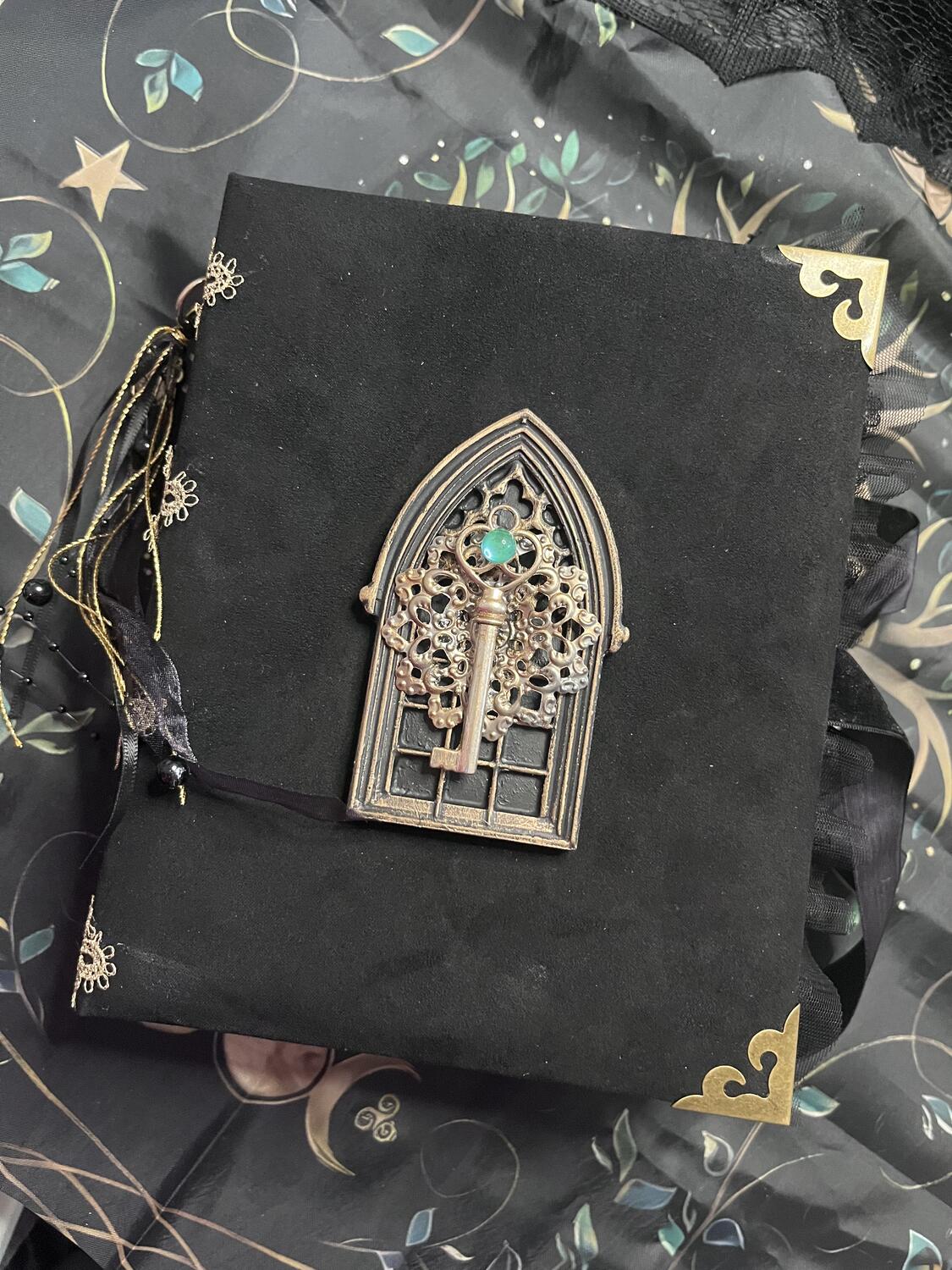 Journal di circa 84 pagine, interamente fatto a mano, carta invecchiata a mano, pizzi, copertina imbottita e nastro in velluto nero, elementi in metallo, completo di tag e cards.