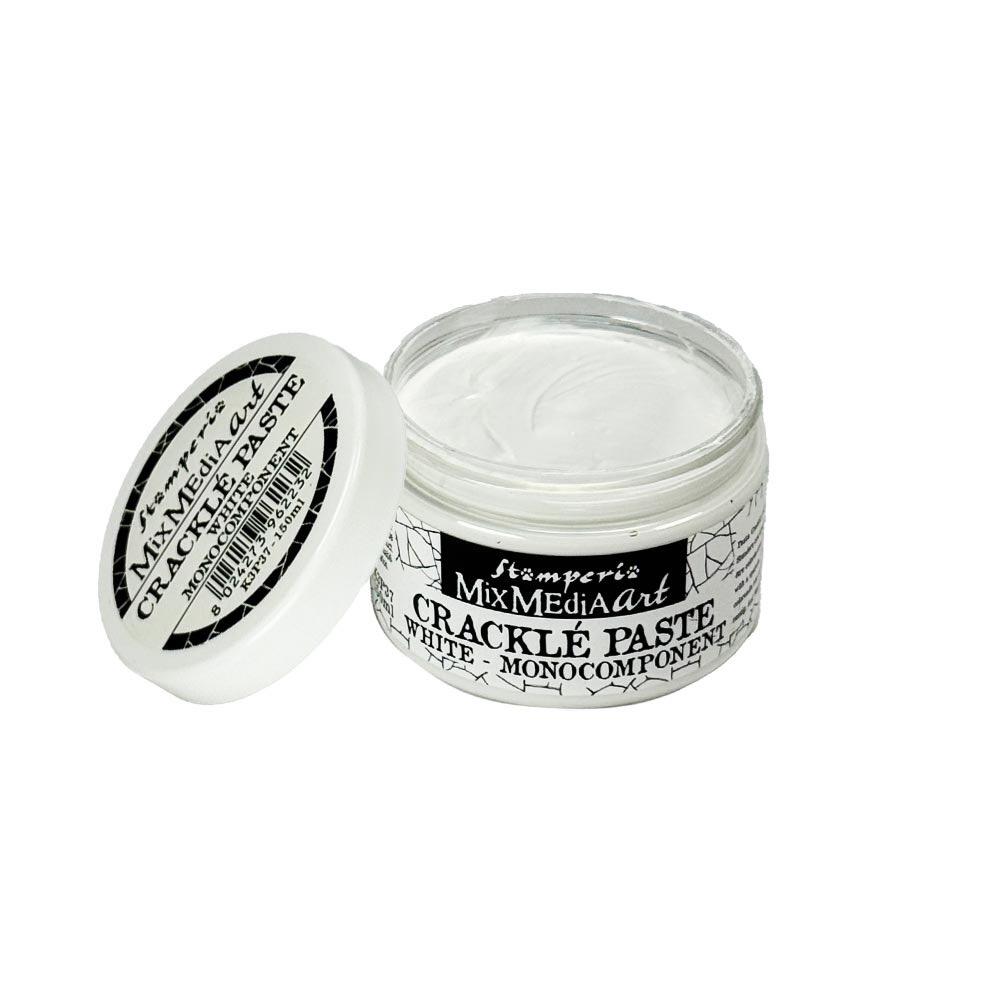 Pasta Cracklé, a base d’acqua, adatta su superfici porose. Necessita di Primer su superfici lisce. Si può colorare con colori acrilici, Acquacolor e Mystik ink. Si può asciugare con il phon.